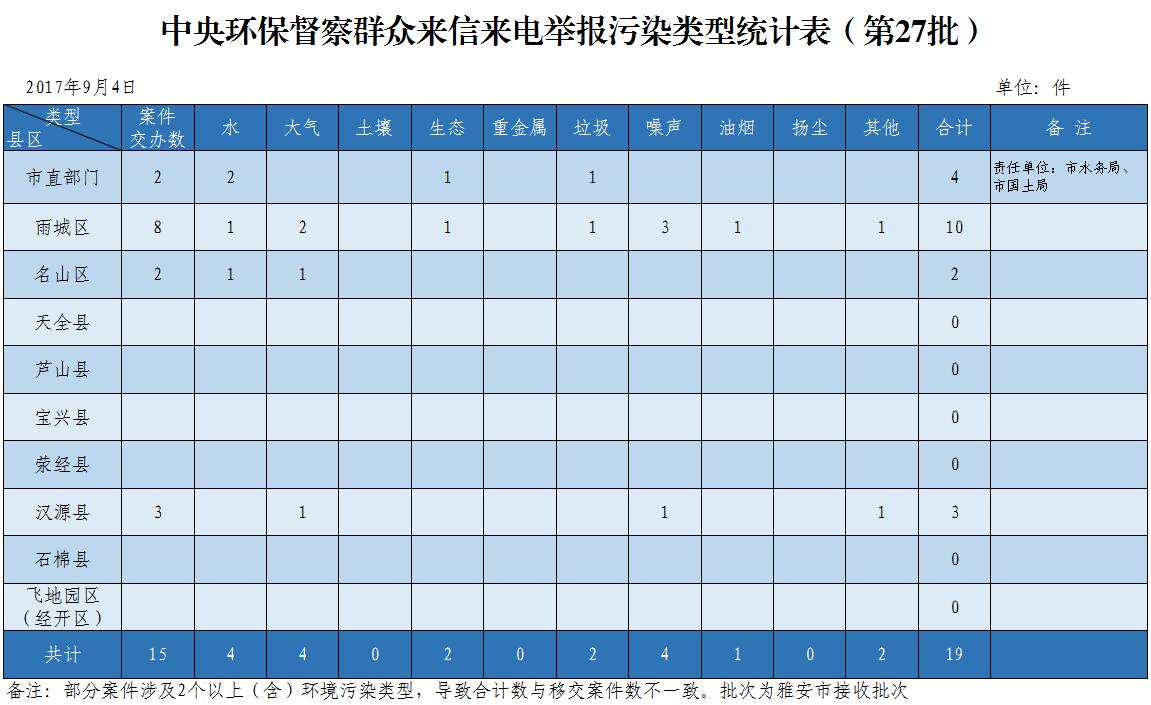 9月4日,中央第五环境保护督察组向我市移交第二十七批信访件共15件。