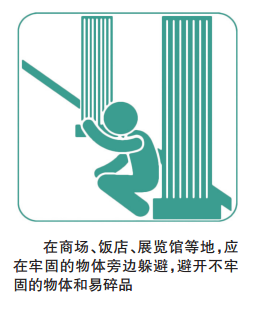 在公共场所的人们应听从工作人员指挥,不要慌乱拥挤,如不得已被挤入人群,要防止摔倒,可双手交叉在胸前保护自己,用肩和背承受外部压力。在影剧院、体育馆等处,可就地蹲下或趴在座椅旁,用背包等护住头部,注意避开吊灯、电扇等悬挂物,待晃动停止后,再有组织地撤离。在商场、书店、展览馆等处,应避开玻璃门窗、橱窗和柜台,避开摆放重物、易碎品的货架,避开广告牌、吊灯等。