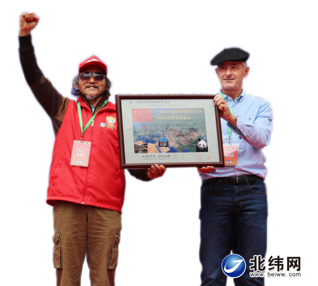 当他步履铿锵地走上台,送上他2014年从雅安出发穿越8个国家骑行至埃斯佩莱特的印有近百个邮戳的路线图时;当他满怀激情地在台上表达他的激动和感谢时——这位身穿红色马甲、满面胡须的老者,众所周知的“熊猫骑侠”罗维孝,注定要吸引在场观众的目光。